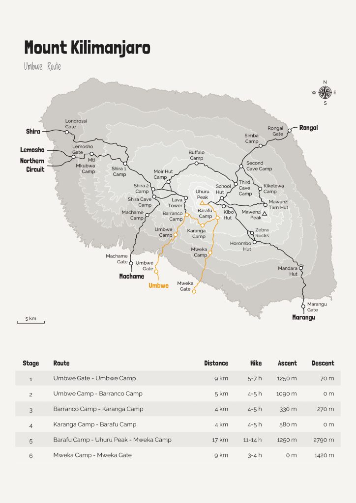The Umbwe Route is the steepest and most challenging path up Mount Kilimanjaro (5,895m/19,341ft). Known for its direct ascent and minimal crowds, this route is ideal for experienced trekkers seeking an adventurous and less-traveled path. Though physically demanding, the 8-day itinerary allows for better acclimatization, increasing the chances of reaching Uhuru Peak.